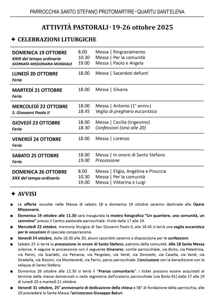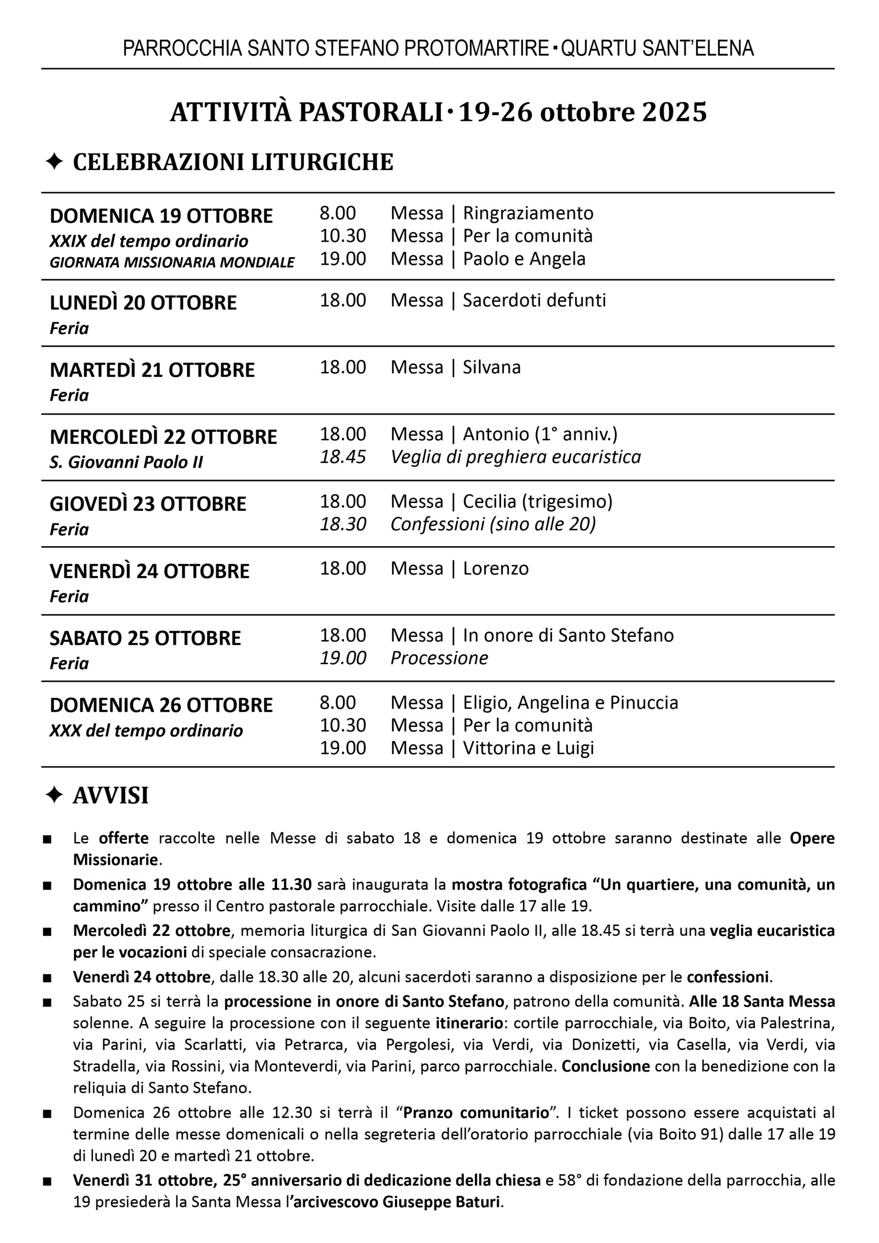 - Le offerte raccolte nelle Messe di sabato 18 e domenica 19 ottobre saranno destinate alle Opere Missionarie.