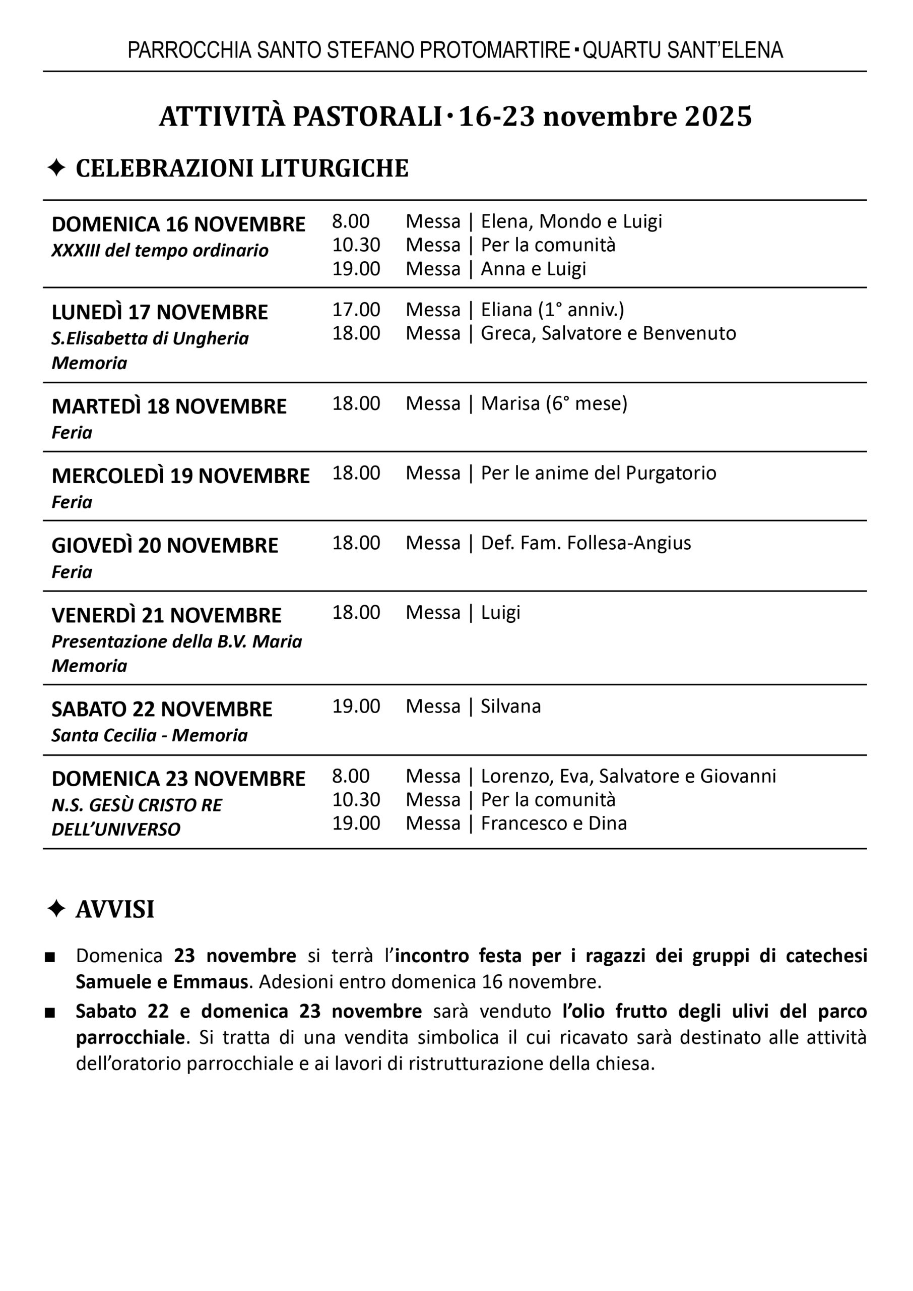 - Domenica 23 novembre si terrà l’incontro festa per i ragazzi dei gruppi di catechesi Samuele e Emmaus. Adesioni entro domenica 16 novembre.