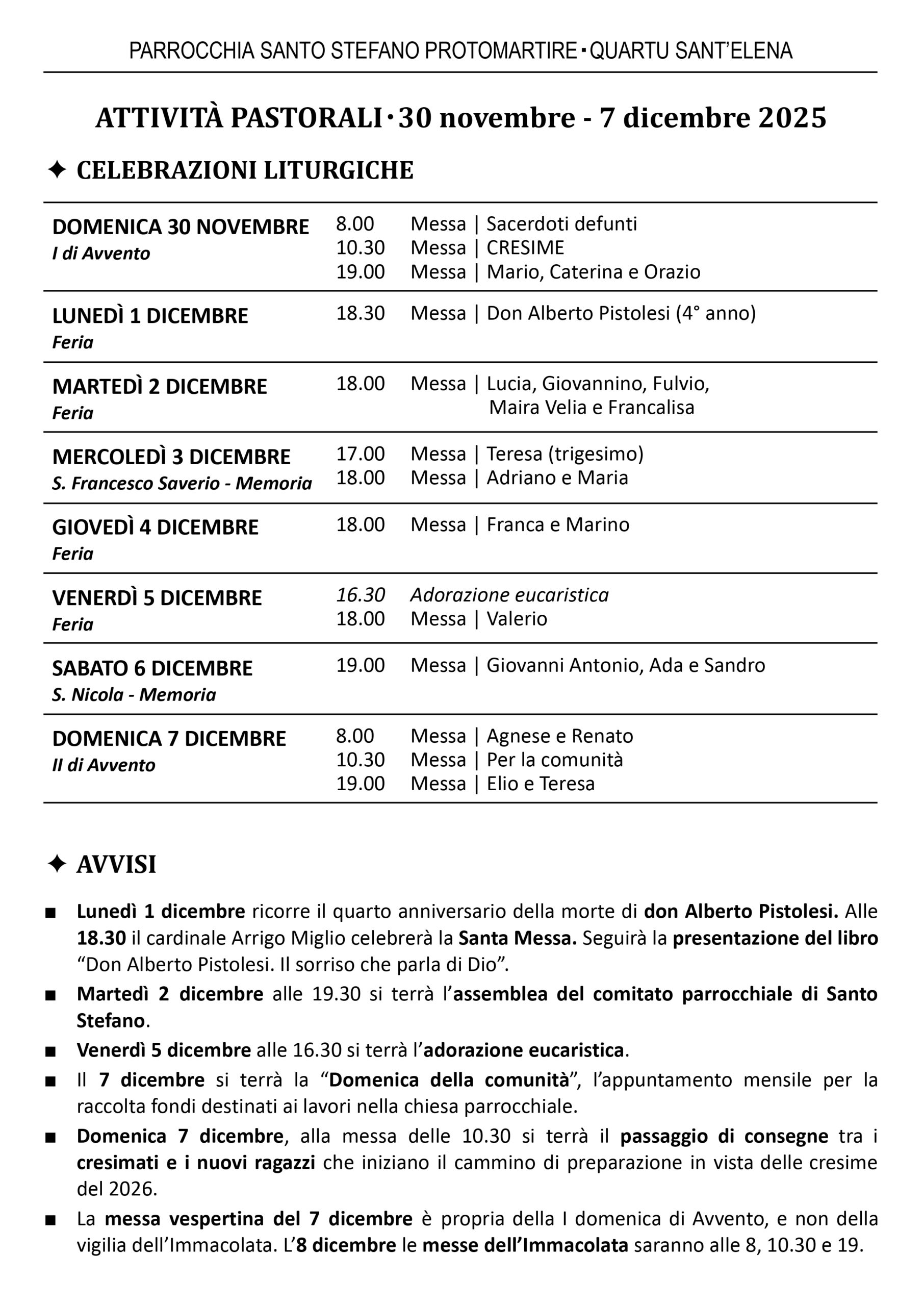 - Domenica 7 dicembre, alla messa delle 10.30 si terrà il passaggio di consegne tra i cresimati e i nuovi ragazzi che iniziano il cammino di preparazione in vista delle cresime del 2026.