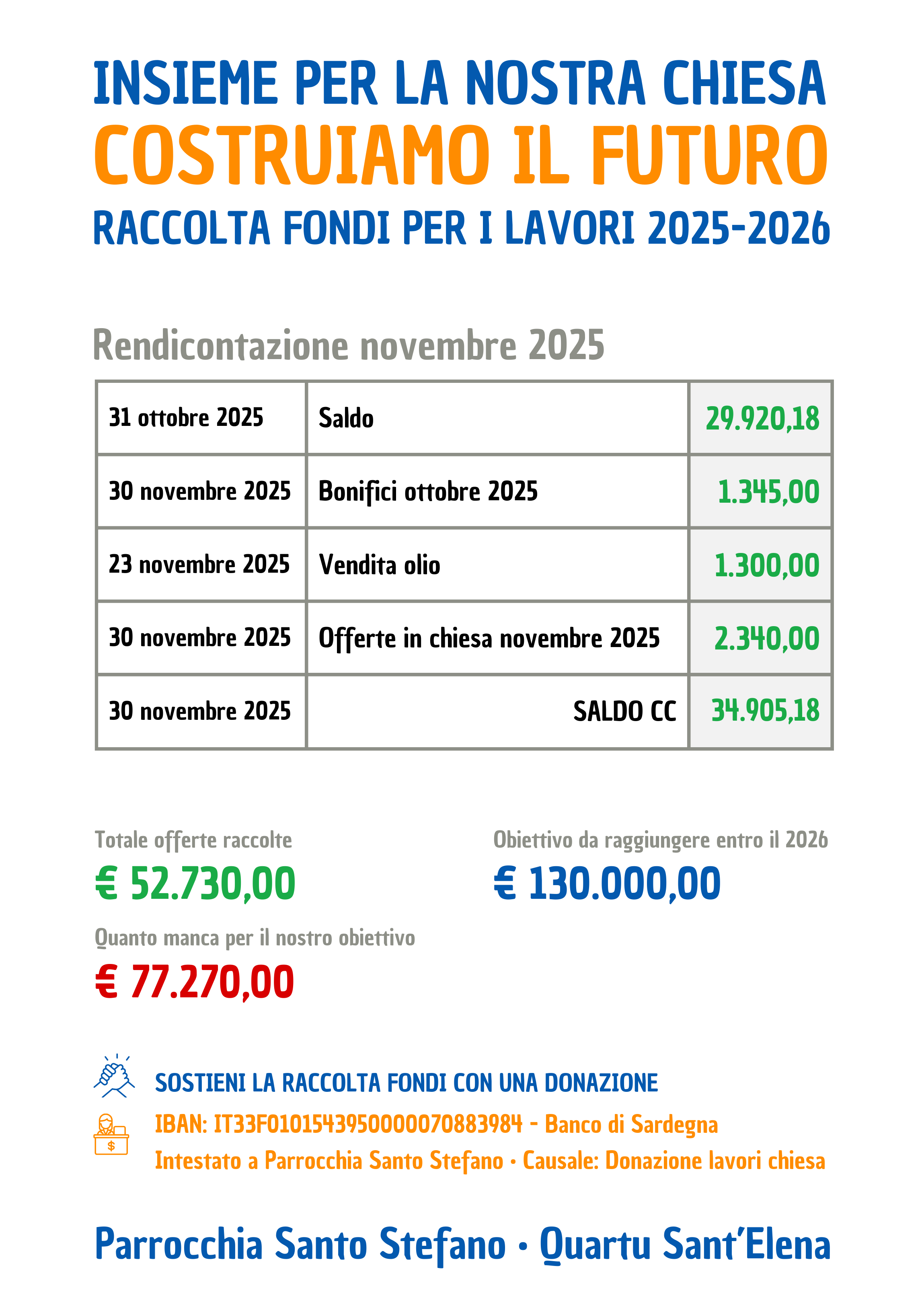 Ogni prima domenica del mese, raccogliamo offerte destinate agli interventi di ristrutturazione e miglioramento della chiesa. È un gesto concreto di cura e responsabilità per la nostra casa comune.