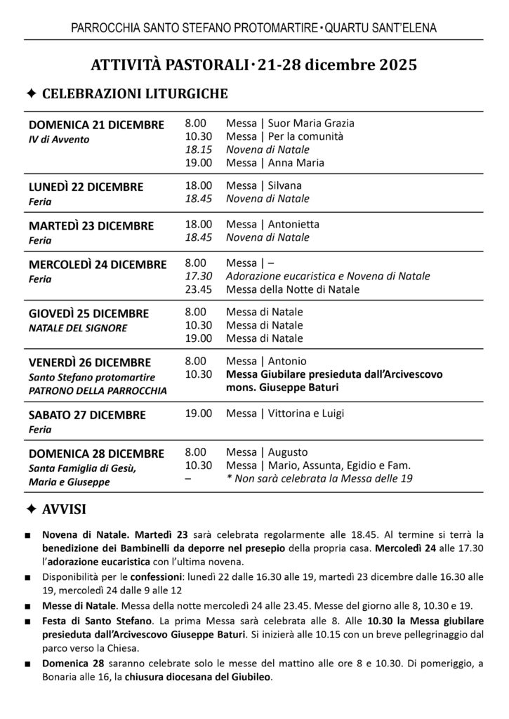 - Domenica 28 saranno celebrate solo le messe del mattino alle ore 8 e 10.30. Di pomeriggio, a Bonaria alle 16, la chiusura diocesana del Giubileo.