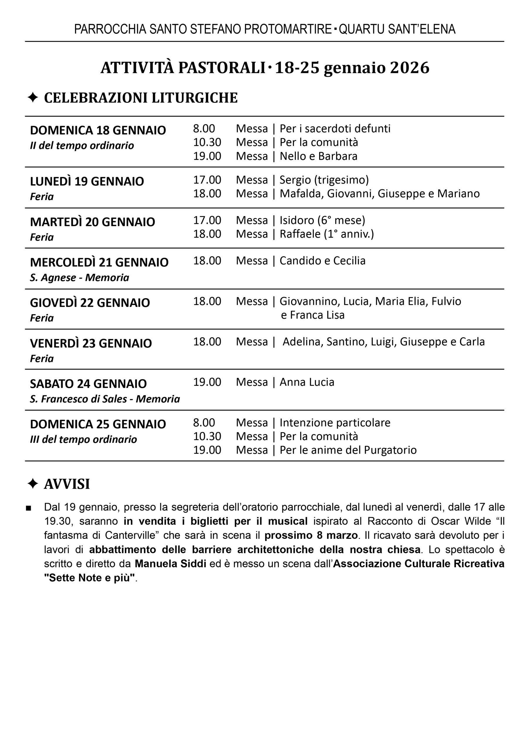 - Dal 19 gennaio, presso la segreteria dell’oratorio parrocchiale, dal lunedì al venerdì, dalle 17 alle 19.30, saranno in vendita i biglietti per il musical ispirato al Racconto di Oscar Wilde “Il fantasma di Canterville” che sarà in scena il prossimo 8 marzo. Il ricavato sarà devoluto per i lavori di abbattimento delle barriere architettoniche della nostra chiesa. Lo spettacolo è scritto e diretto da Manuela Siddi ed è messo un scena dall’Associazione Culturale Ricreativa “Sette Note e più”.