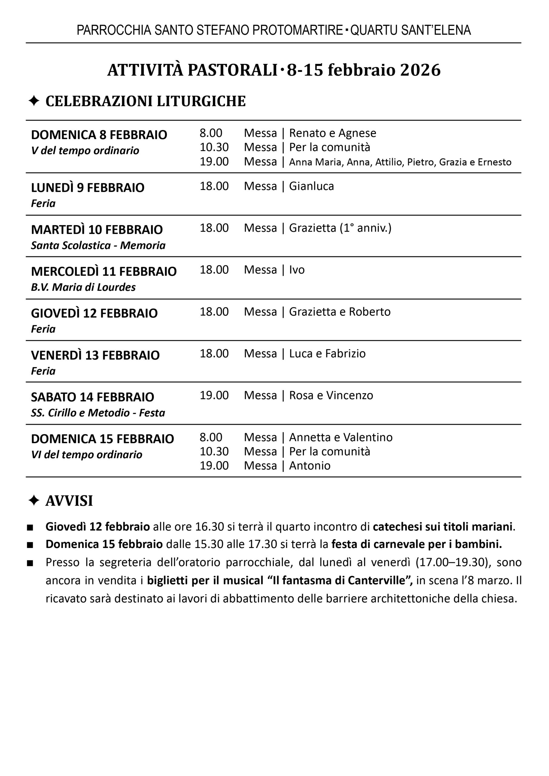 - Presso la segreteria dell’oratorio parrocchiale, dal lunedì al venerdì (17.00–19.30), sono ancora in vendita i biglietti per il musical “Il fantasma di Canterville”, in scena l’8 marzo. Il ricavato sarà destinato ai lavori di abbattimento delle barriere architettoniche della chiesa.