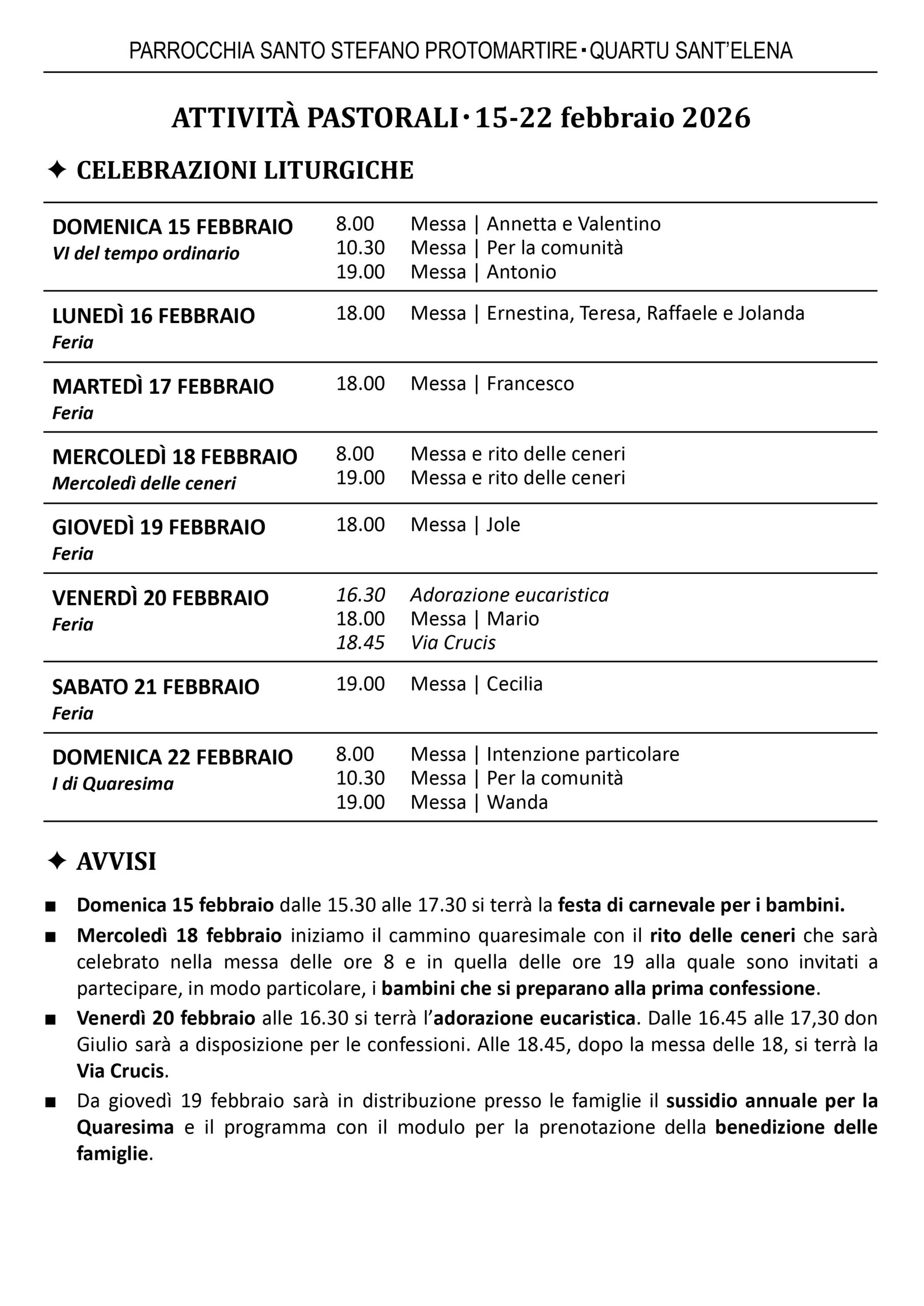 - Da giovedì 19 febbraio sarà in distribuzione presso le famiglie il sussidio annuale per la Quaresima e il programma con il modulo per la prenotazione della benedizione delle famiglie.