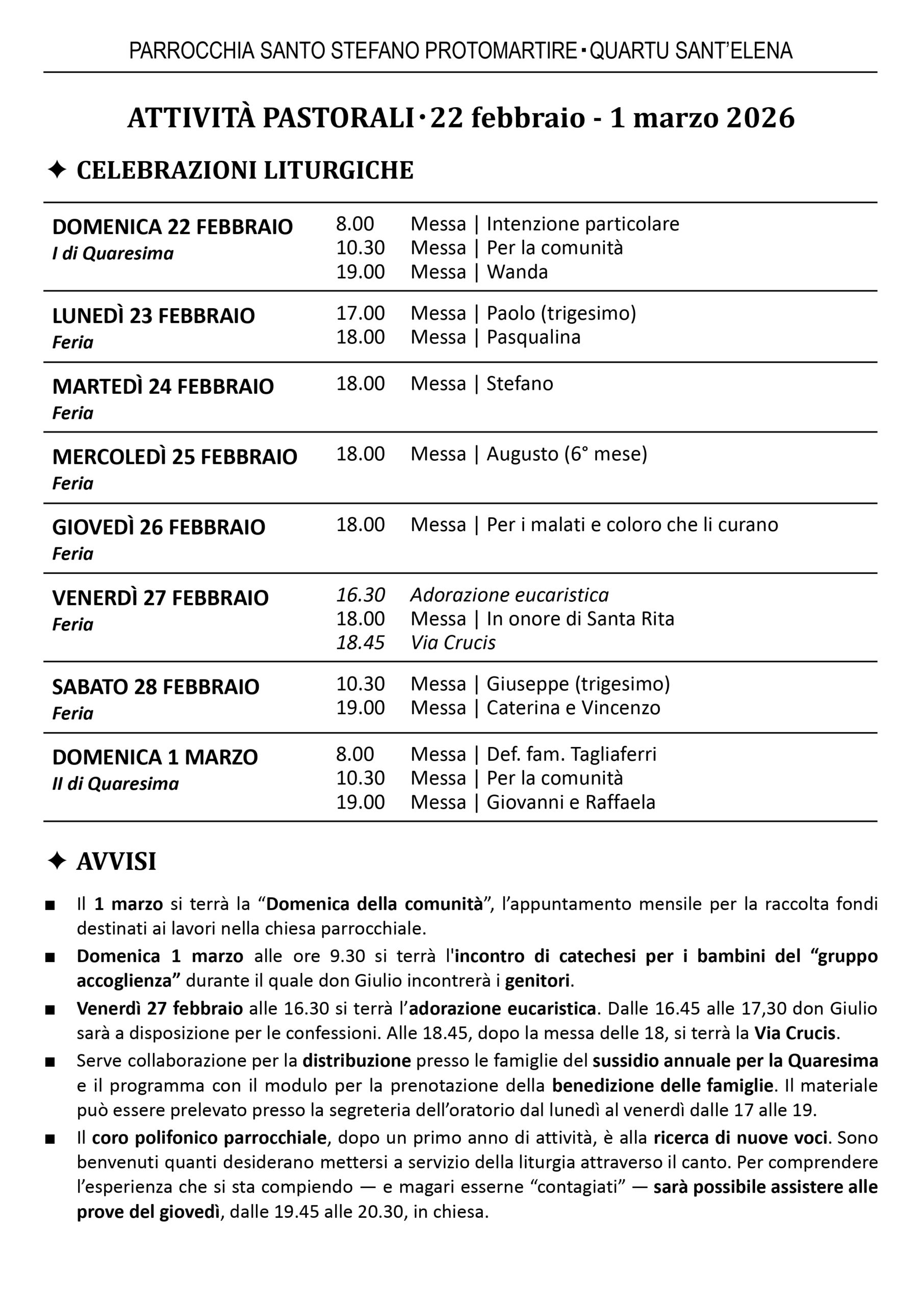 - Il 1 marzo si terrà la “Domenica della comunità”, l’appuntamento mensile per la raccolta fondi destinati ai lavori nella chiesa parrocchiale.