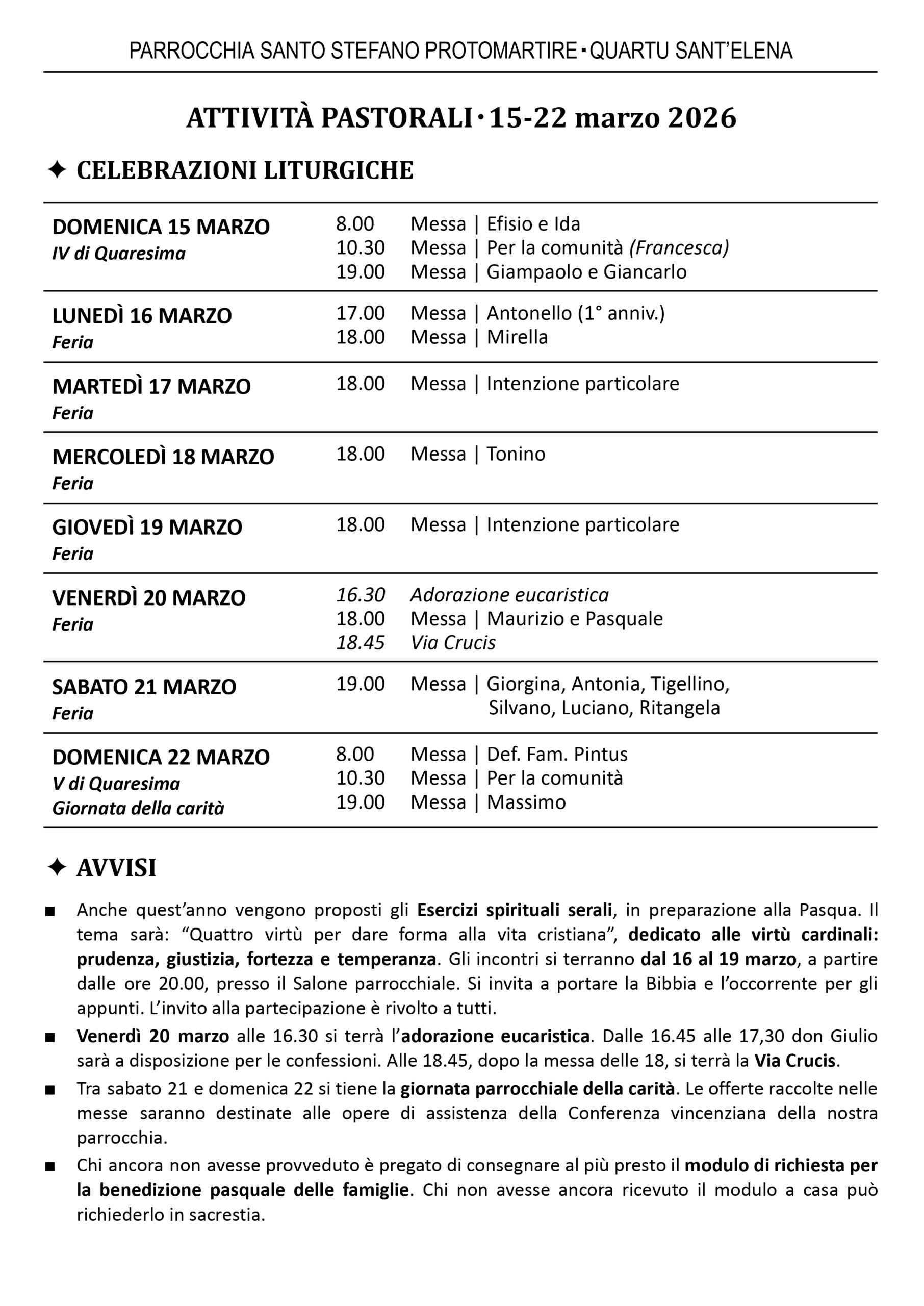 - Venerdì 20 marzo alle 16.30 si terrà l’adorazione eucaristica. Dalle 16.45 alle 17,30 don Giulio sarà a disposizione per le confessioni. Alle 18.45, dopo la messa delle 18, si terrà la Via Crucis.