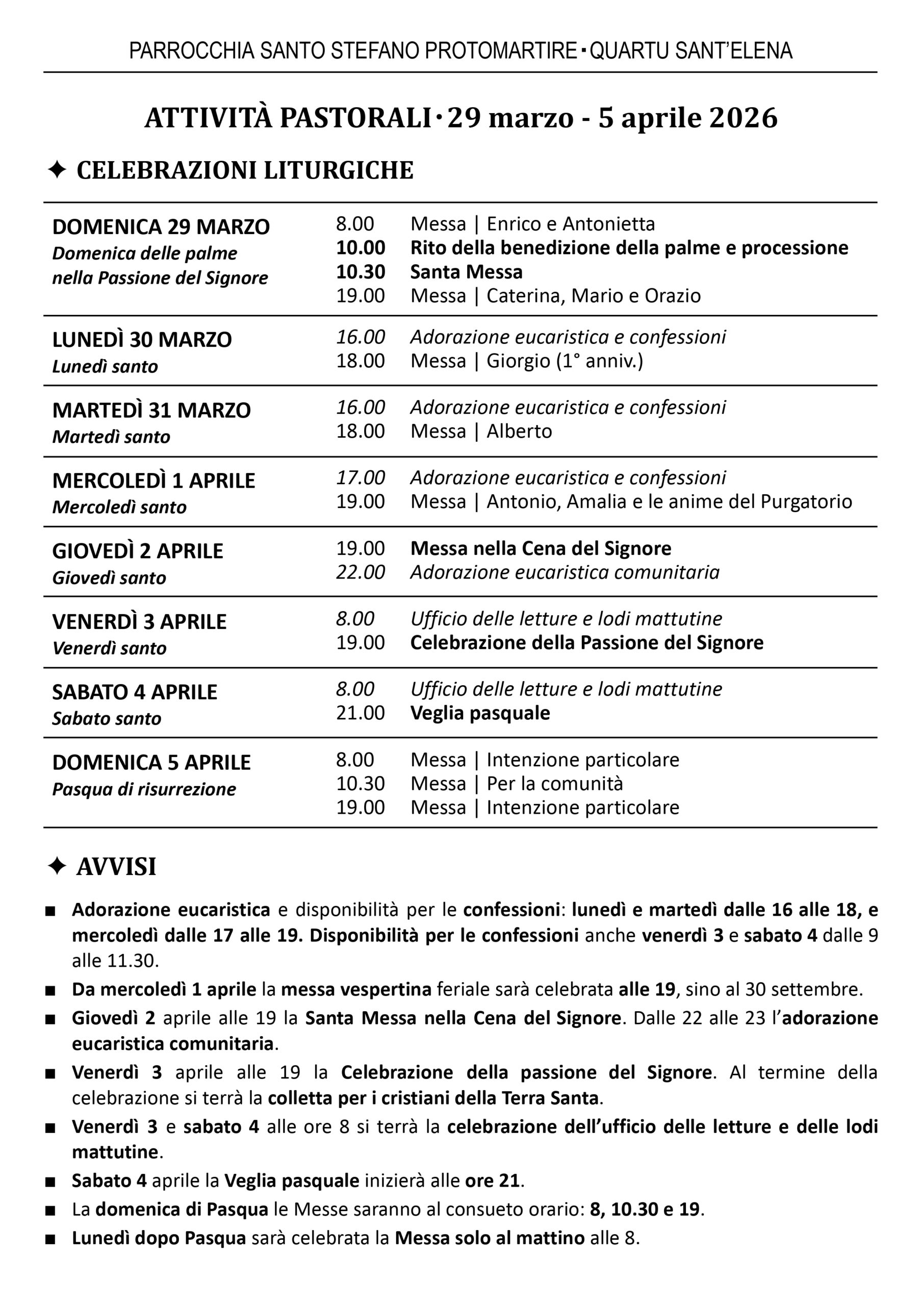 - Da mercoledì 1 aprile la messa vespertina feriale sarà celebrata alle 19, sino al 30 settembre.