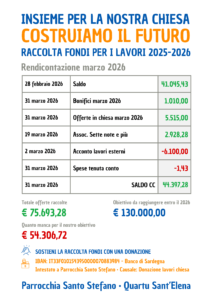 Ogni prima domenica del mese, raccogliamo offerte destinate agli interventi di ristrutturazione e miglioramento della chiesa. È un gesto concreto di cura e responsabilità per la nostra casa comune.