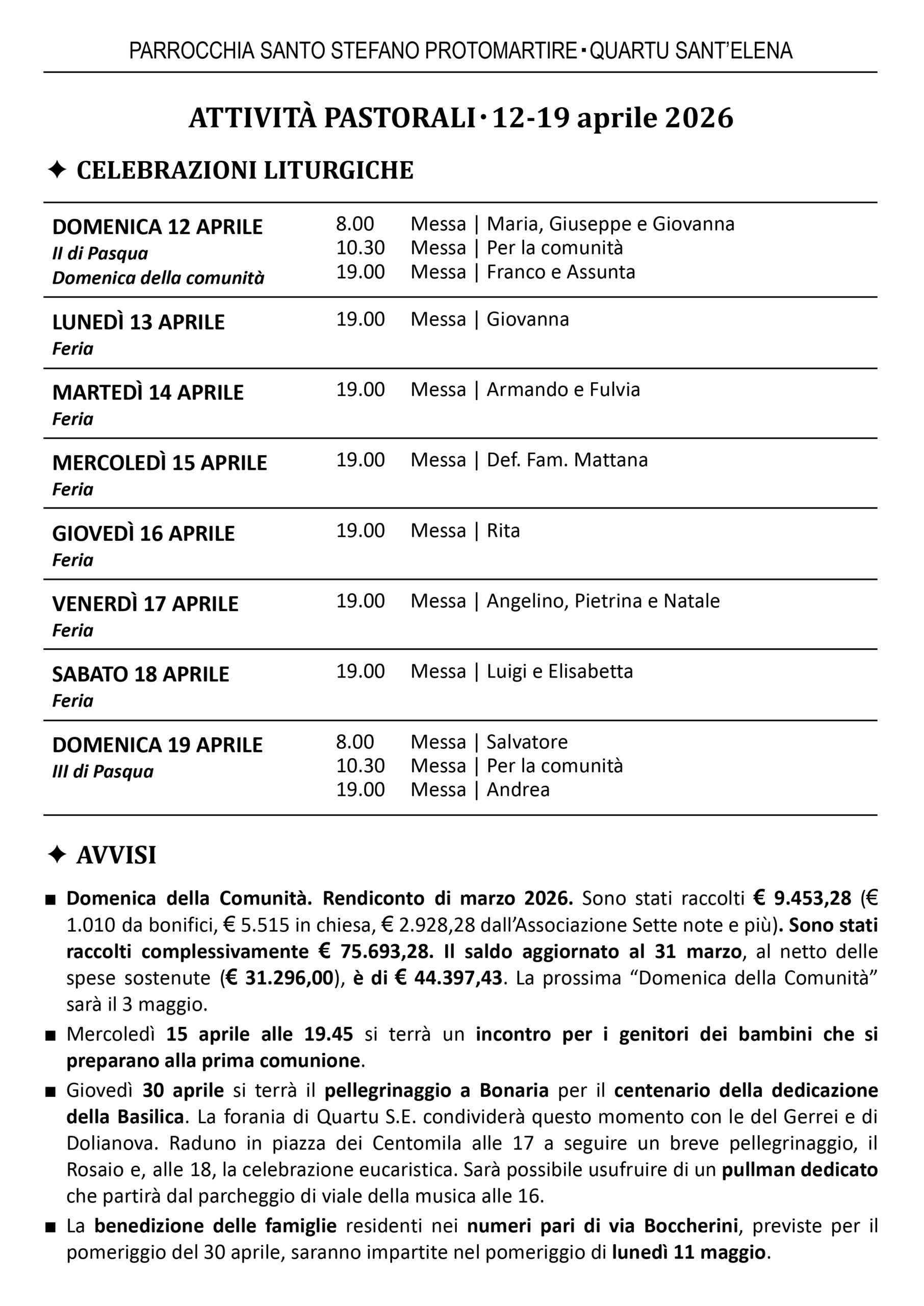 - Domenica della Comunità. Rendiconto di marzo 2026. Sono stati raccolti € 9.453,28 (€ 1.010 da bonifici, € 5.515 in chiesa, € 2.928,28 dall’Associazione Sette note e più). Sono stati raccolti complessivamente € 75.693,28. Il saldo aggiornato al 31 marzo, al netto delle spese sostenute (€ 31.296,00), è di € 44.397,43. La prossima “Domenica della Comunità” sarà il 3 maggio.