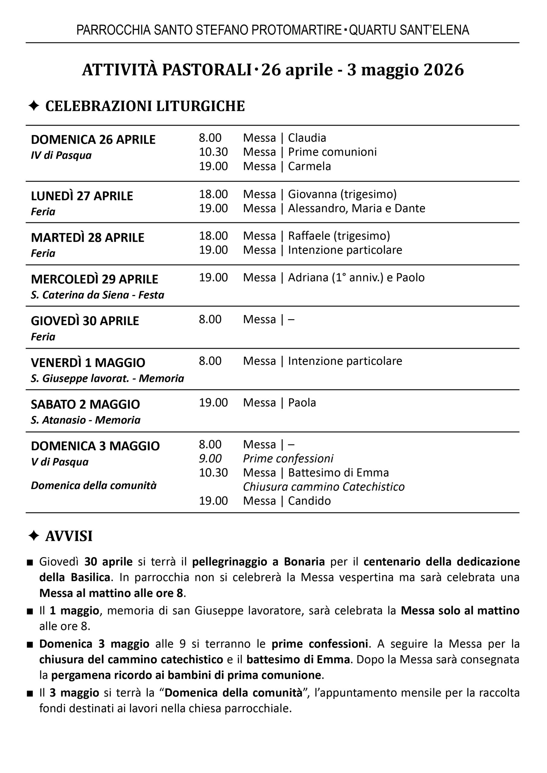- Giovedì 30 aprile si terrà il pellegrinaggio a Bonaria per il centenario della dedicazione della Basilica. In parrocchia non si celebrerà la Messa vespertina ma sarà celebrata una Messa al mattino alle ore 8.